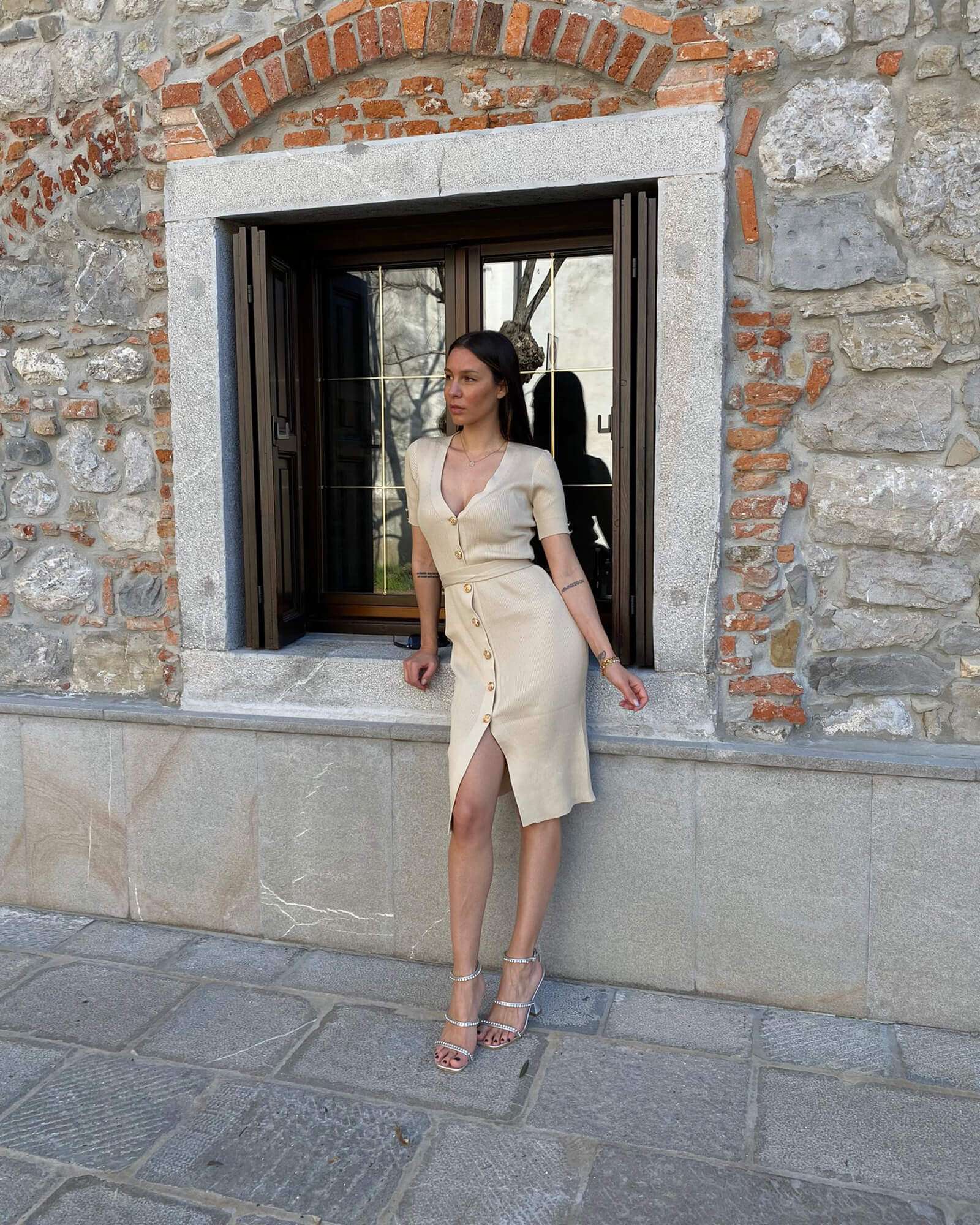 Abito in maglia a costine beige lungo al polpaccio con cintura in vita e bottoni al centro davanti. Sono presenti anche due bottoni sulle maniche corte.