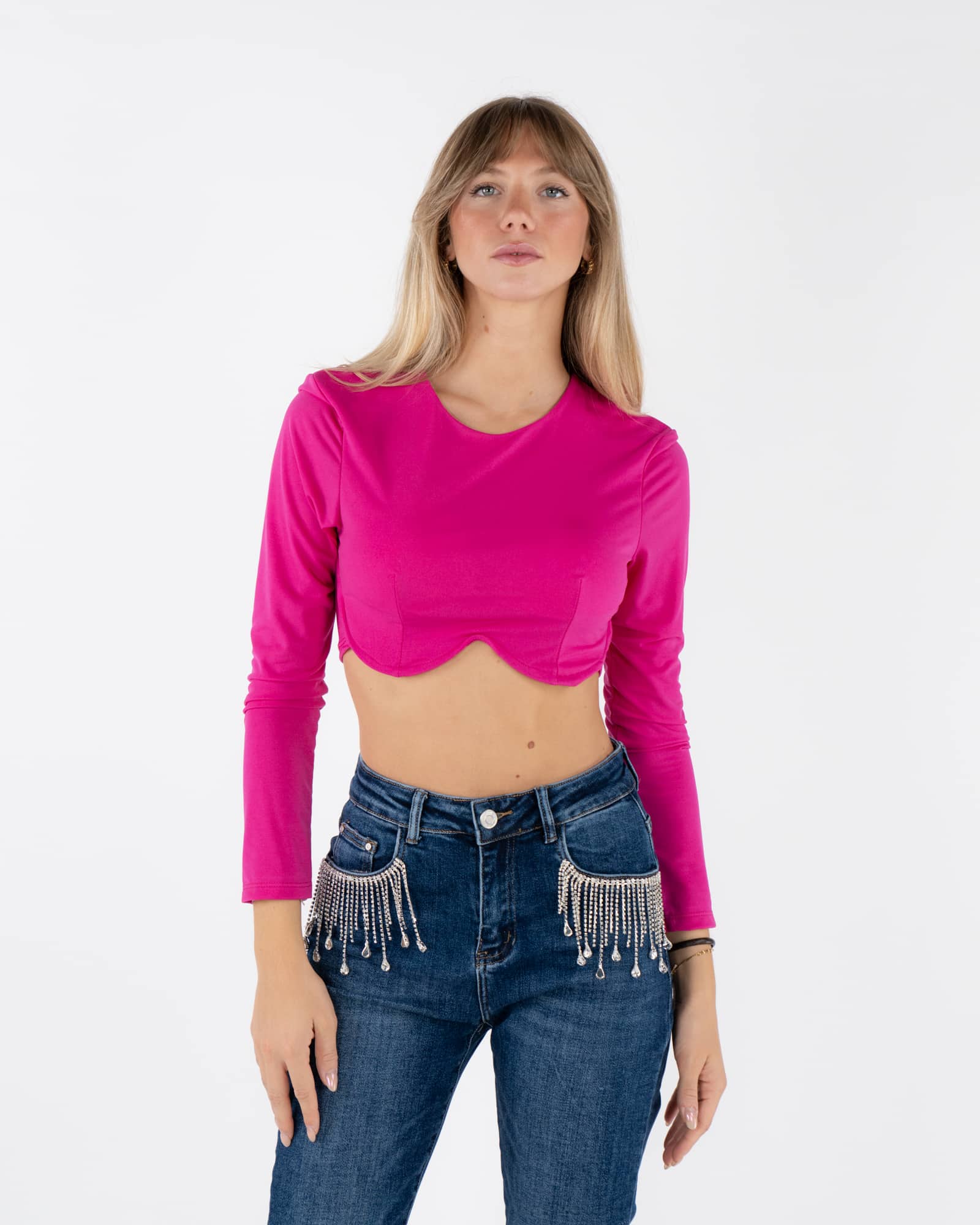 Maglia cropped con collo rotondo e maniche lunghe.